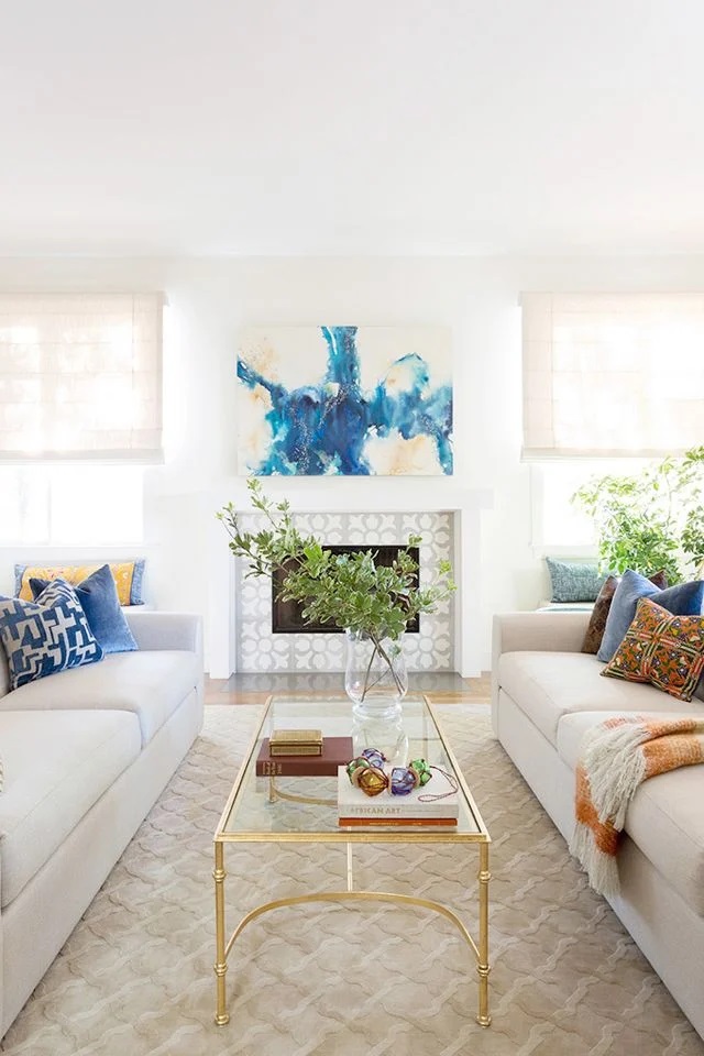 Θερμά χρώματα εναντίον ψυχρών! Ένας εντυπωσιακός αφηρημένος πίνακας κλέβει την παράσταση σε αυτό το σαλόνι, αποδεικνύοντας ότι η τέχνη είναι ο γρηγορότερος τρόπος για να γίνει κάθε δωμάτιο ζωντανό! Οι ζεστοί πορτοκαλί τόνοι συμβάλλουν στην εξισορρόπηση των ψυχρών μπλε αποχρώσεων, διατηρώντας το σαλόνι ισορροπημένο και φιλόξενο.